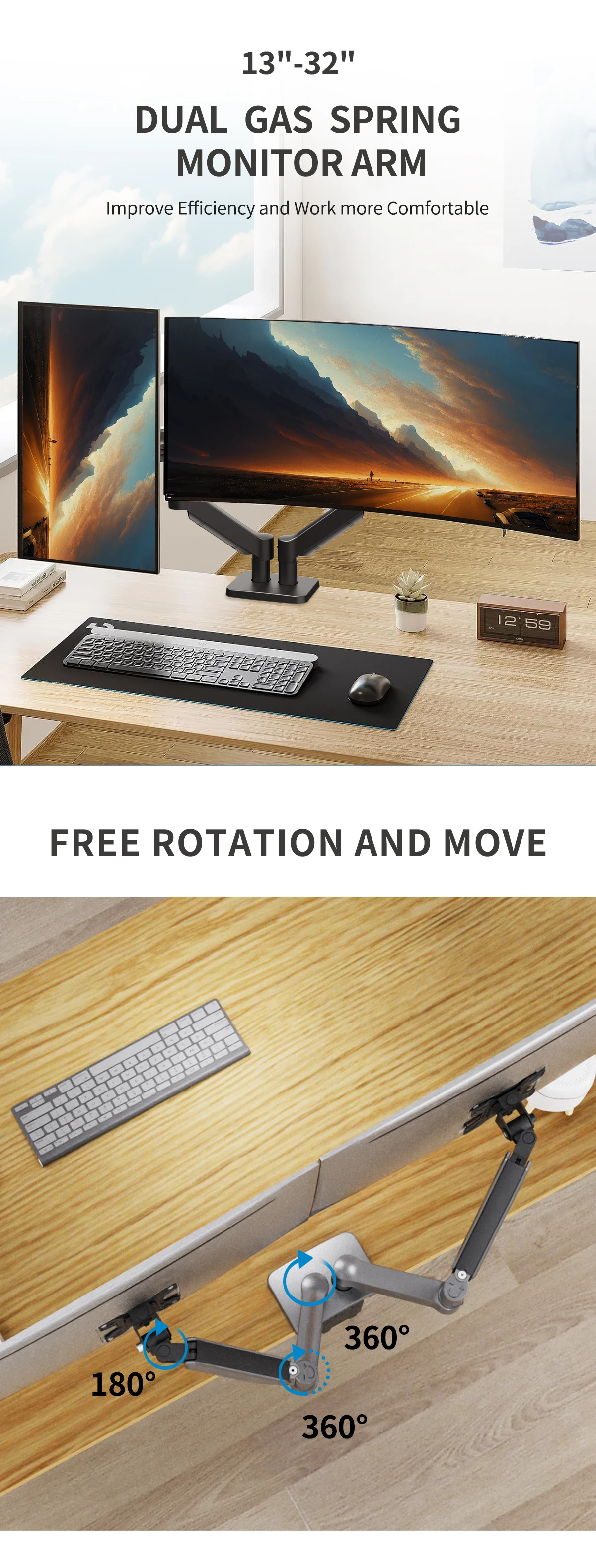 Supporto Doppio Monitor a Braccio con Molla a Gas - Regolazione Altezza e Rotazione 360° per Schermi 13-32