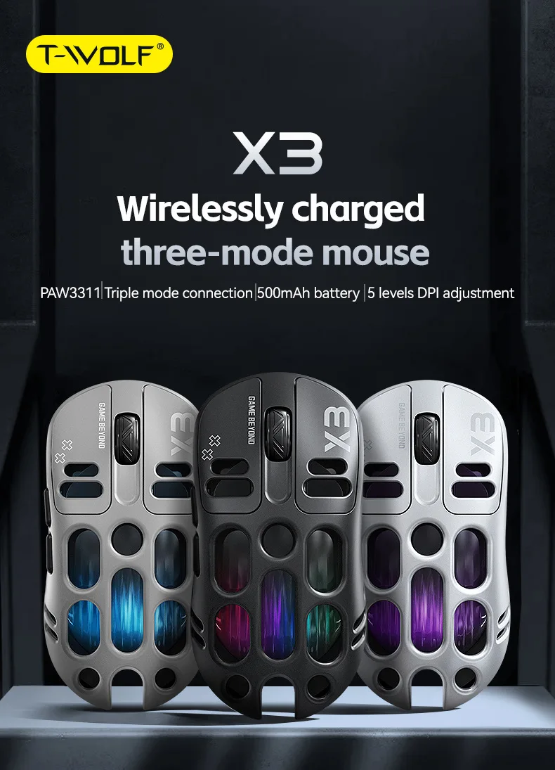 T-WOLF X3 Mouse Wireless - Sensore PAW3311, Luce RGB Multicolore, Compatibile con PC, Laptop e Mac